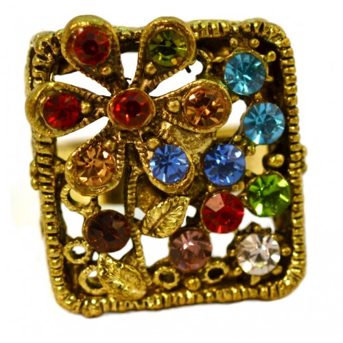 Объёмный плетёный перстень из ювелирного сплава квадратной формы имеет необычный орнамент. Его поверхность усеяна стразами голубого, светло-розового, тёмно-розового, красного, бирюзового и фиолетового цветов, которые создают разноцветный яркий цветок. По соседству с ним возвышается ещё один цветок, выполненный из металла, в каждом лепестке которого присутствует свой тёплый цвет стразов с небольшими вкраплениями холодного.